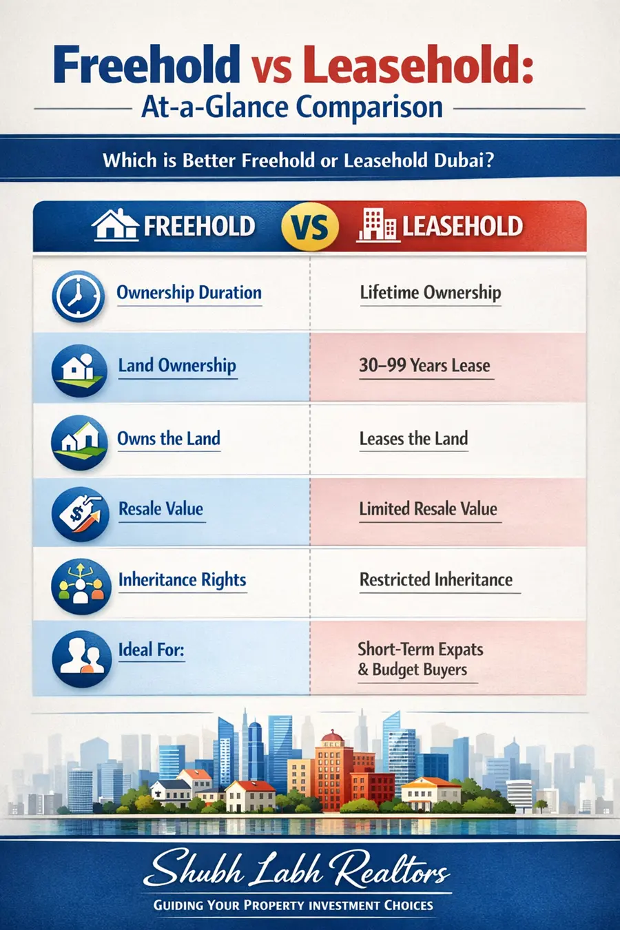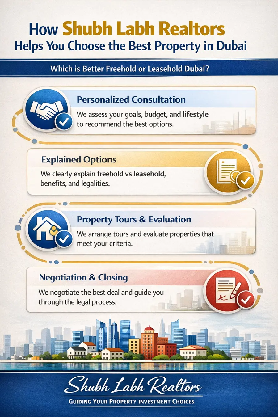 Partner with Shubh Labh Realtors for invaluable guidance. Whether you want to understand freehold property in Dubai explained or explore niche leasehold options, Shubh Labh Realtors is ready to guide you every step of the way. Our team focuses on connecting buyers with the ideal property, rather than just any property.