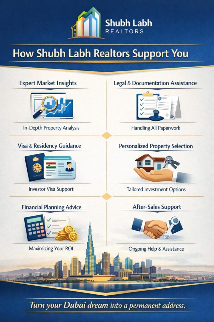 Shubh Labh Realtors will help you reach your goal to become an expat resident of Dubai in 2026 through their complete support system. Your long-term future in Dubai begins with two essential elements, which include your investment choice and your selection of a professional advisor who will assist you.