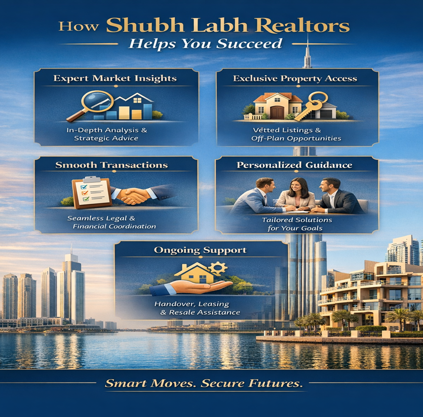 At Shubh Labh Realtors, we specialize in Dubai property investment, offering trustworthy and growth-oriented opportunities for investors. By combining in-depth market insights with Vastu-compliant property principles, we create harmonious living and investment spaces that balance prosperity, functionality, and long-term value in Dubai’s real estate market.