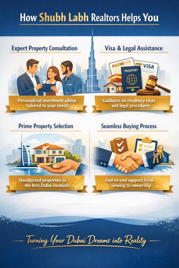 Whether you’re considering Dubai real estate for expats, evaluating property ownership advantages in Dubai, or planning to settle in Dubai as an expat in 2026, their expert team simplifies your journey. Shubh Labh Realtors don’t just help you buy property; they help you make smart, confident, and profitable decisions.
